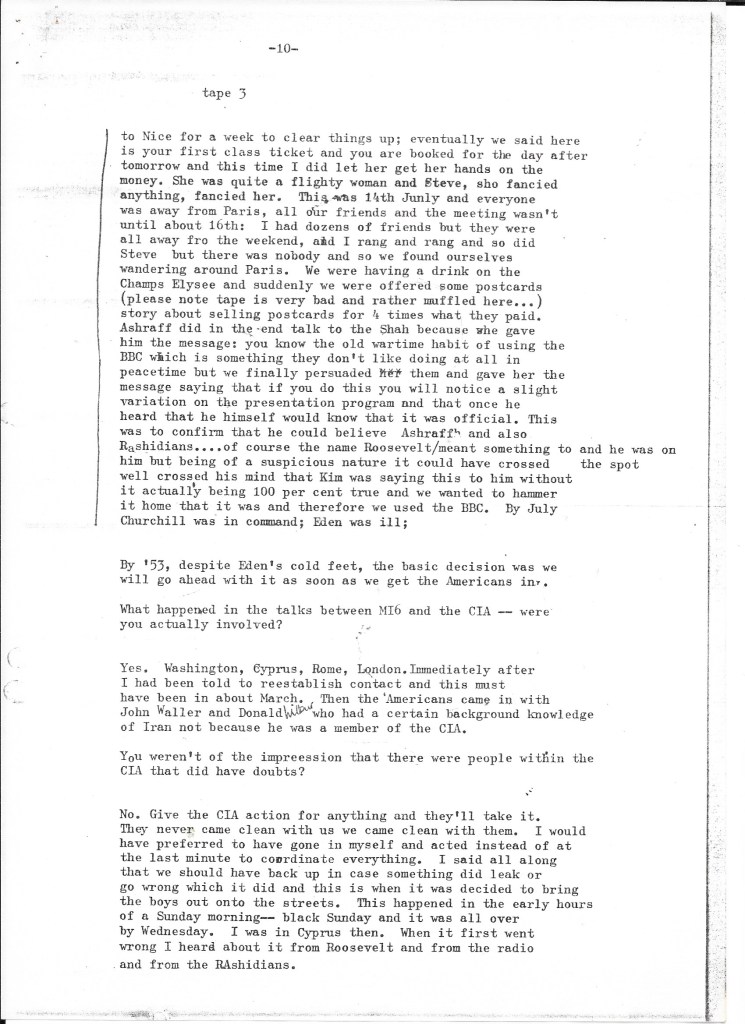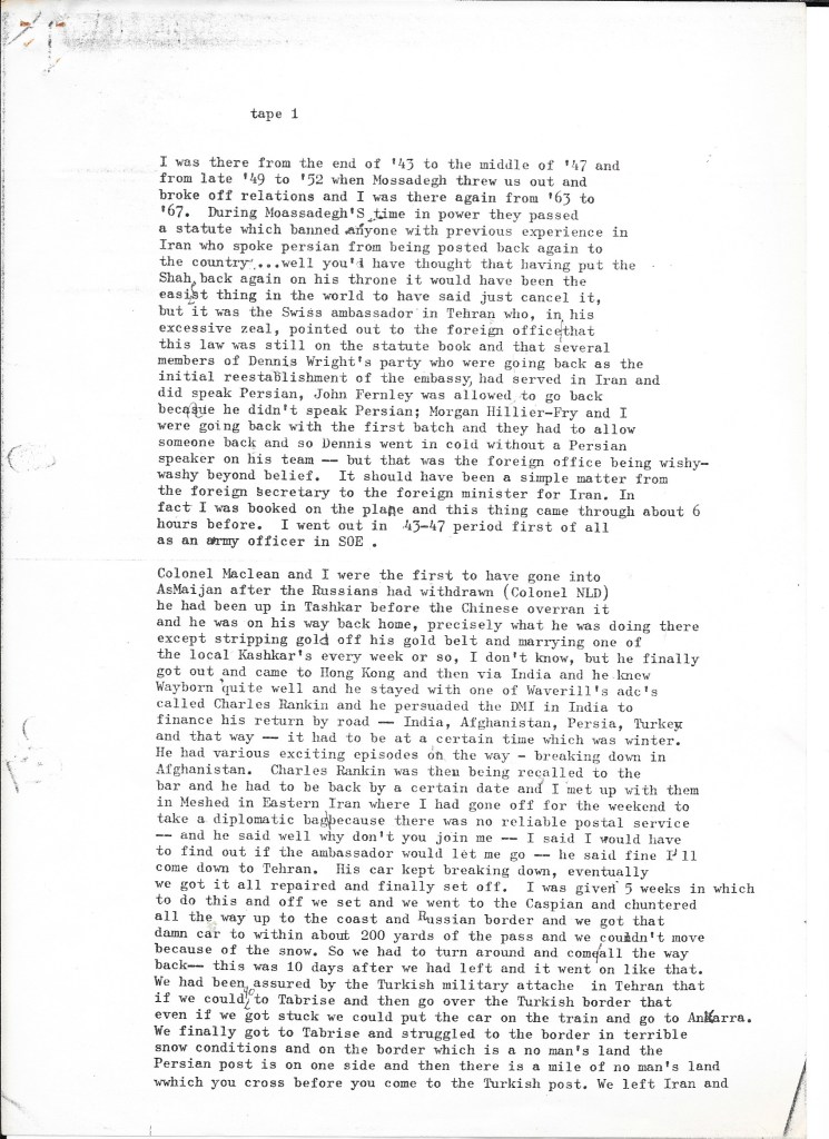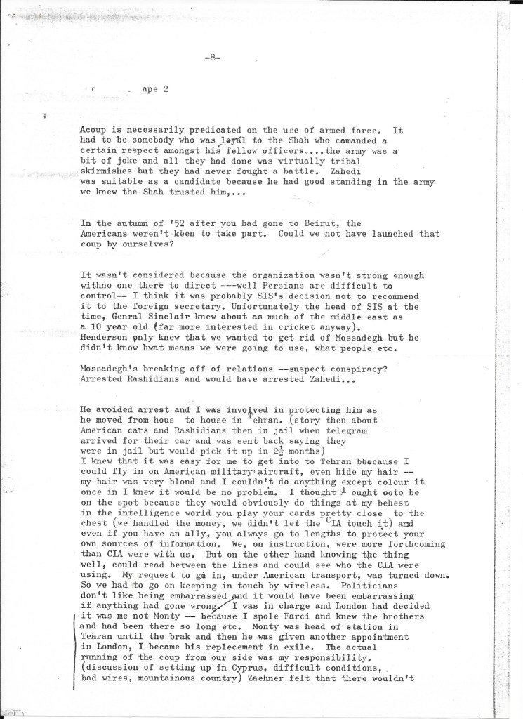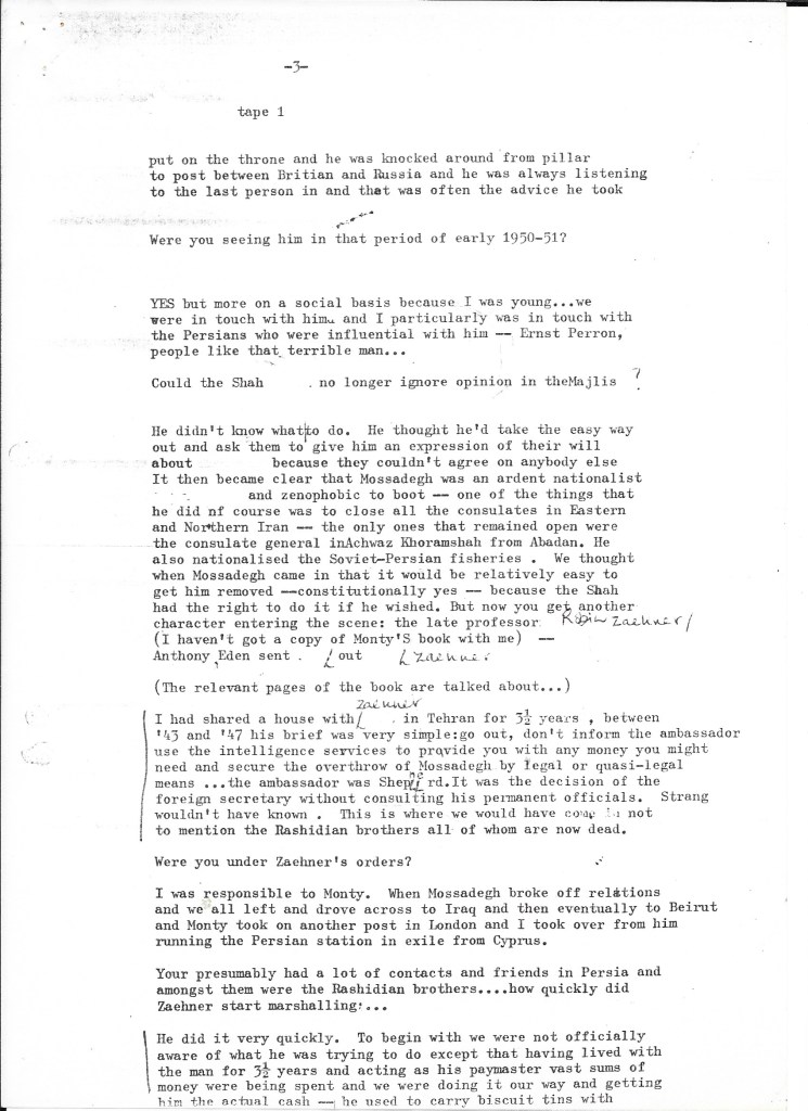 What we learned confirmed that the British government had played an integral – indeed, initiating – role in the success of the coup d’état that removed democratically elected Prime Minister Mohammad Mossadegh from power. The recorded interview was transcribed using a typewriter or a very early word processor in our small production office in Upper James Street, W1 (we assume by Alison given the number of typing errors). We kept it on file as we continued the research for our film about Britain’s role in Iran in the early 1950s. It informed all our filmed interviews, especially with British embassy staff who’d worked alongside Darbyshire such as Sam Falle and with the former CIA agents Stephen Meade and Richard Cottam.