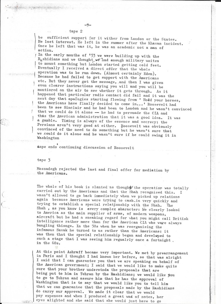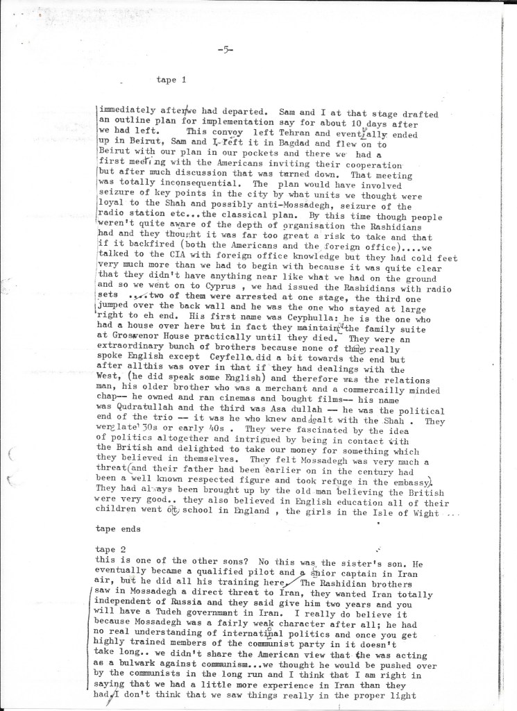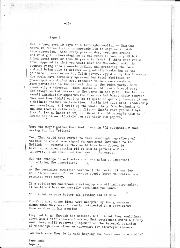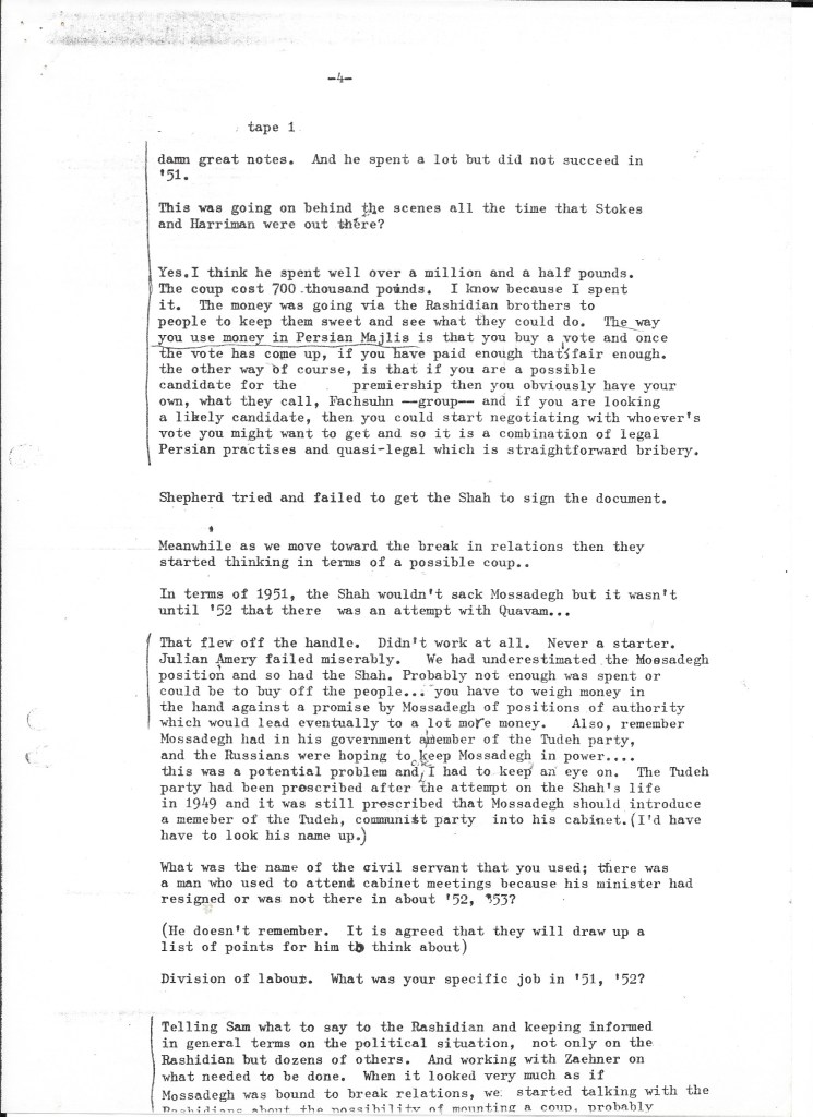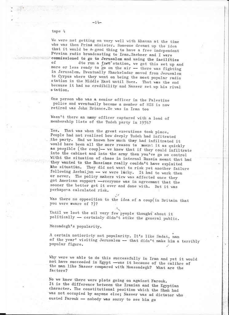 What we learned confirmed that the British government had played an integral – indeed, initiating – role in the success of the coup d’état that removed democratically elected Prime Minister Mohammad Mossadegh from power. The recorded interview was transcribed using a typewriter or a very early word processor in our small production office in Upper James Street, W1 (we assume by Alison given the number of typing errors). We kept it on file as we continued the research for our film about Britain’s role in Iran in the early 1950s. It informed all our filmed interviews, especially with British embassy staff who’d worked alongside Darbyshire such as Sam Falle and with the former CIA agents Stephen Meade and Richard Cottam.